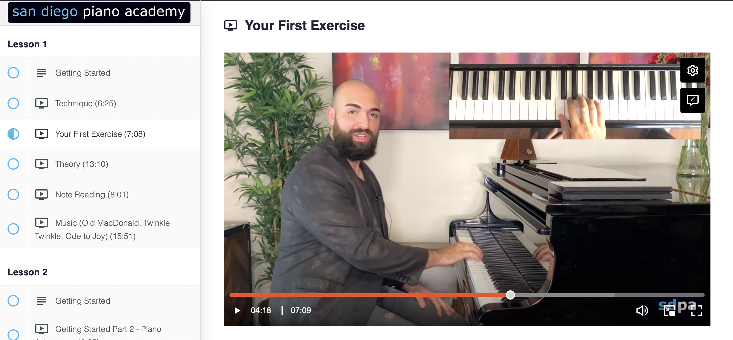 San Diego Piano Academy's online course is a massive course that systematically takes anyone through 5 levels of piano training, designed to get you all the way to a flawless, high, intermediate level.